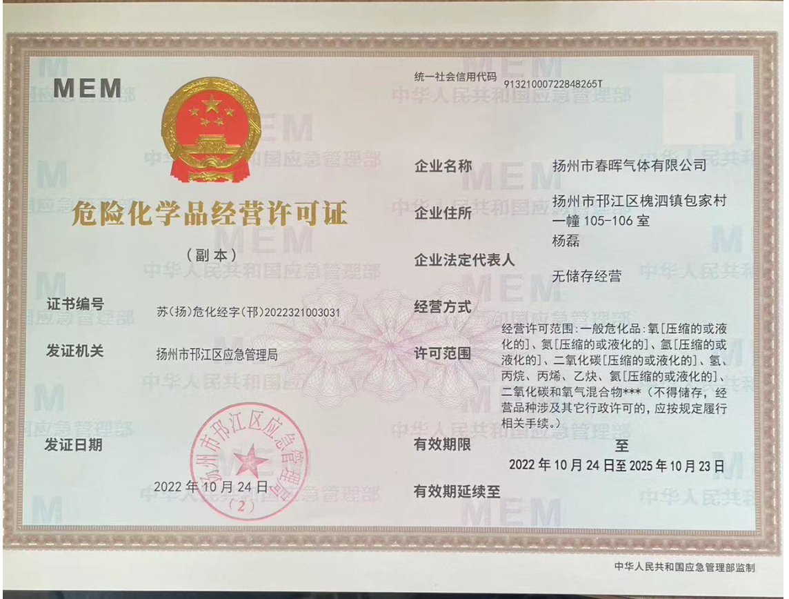 揚(yáng)州市春暉氣體有限公司于1993年揚(yáng)計(jì)經(jīng)(93)技字第042號(hào)文批準(zhǔn)生產(chǎn)工業(yè)氧氣、氮?dú)夂投趸肌F髽I(yè)擁有固定資產(chǎn)3000多萬(wàn)元,占地面積15000m2,建筑面積7000 m2,職工總?cè)藬?shù)68名,初級(jí)職稱人員10名,高級(jí)職稱人員2名,各種特種作業(yè)持證人員20名?! ∑髽I(yè)下設(shè)2個(gè)分公司及1個(gè)鋼瓶檢驗(yàn)站。即春暉氣體有限公司酒甸分公司、春暉危險(xiǎn)品運(yùn)輸有限公司、無(wú)縫氣瓶檢驗(yàn)站。主要生產(chǎn)經(jīng)營(yíng)產(chǎn)品有:液化及瓶裝氧、氮、氬、二氧化碳、乙炔、丙烷、液化天然氣、混合氣及各種高純氣體、干冰、鋼瓶...【查看更多】